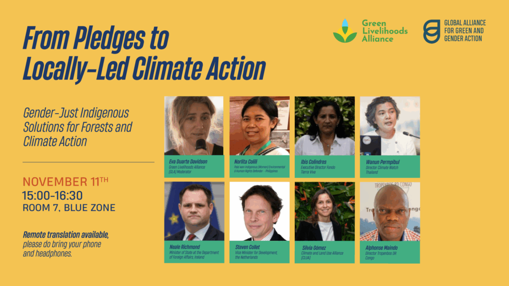 Co-hosted with the Green Livelihoods Alliance (GLA), this event showcases Indigenous and women-led forest and climate solutions that are already halting deforestation and restoring ecosystems. It facilitates dialogues between community leaders, policy makers and funds, calling for direct, equitable finance to scale these locally led, gender-just models and turn global pledges into measurable community action.
